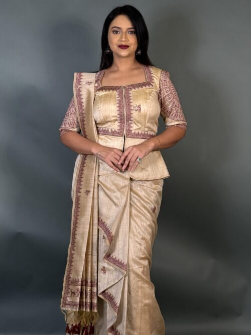 Royal Maroon Virgin Tussar Silk Ready-to-Wear Saree Set