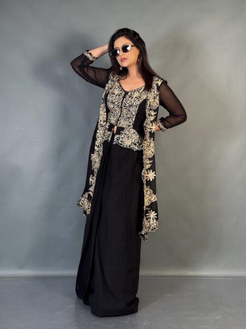 Peacock Elegance Satin Crepe Indo‑Western Dress