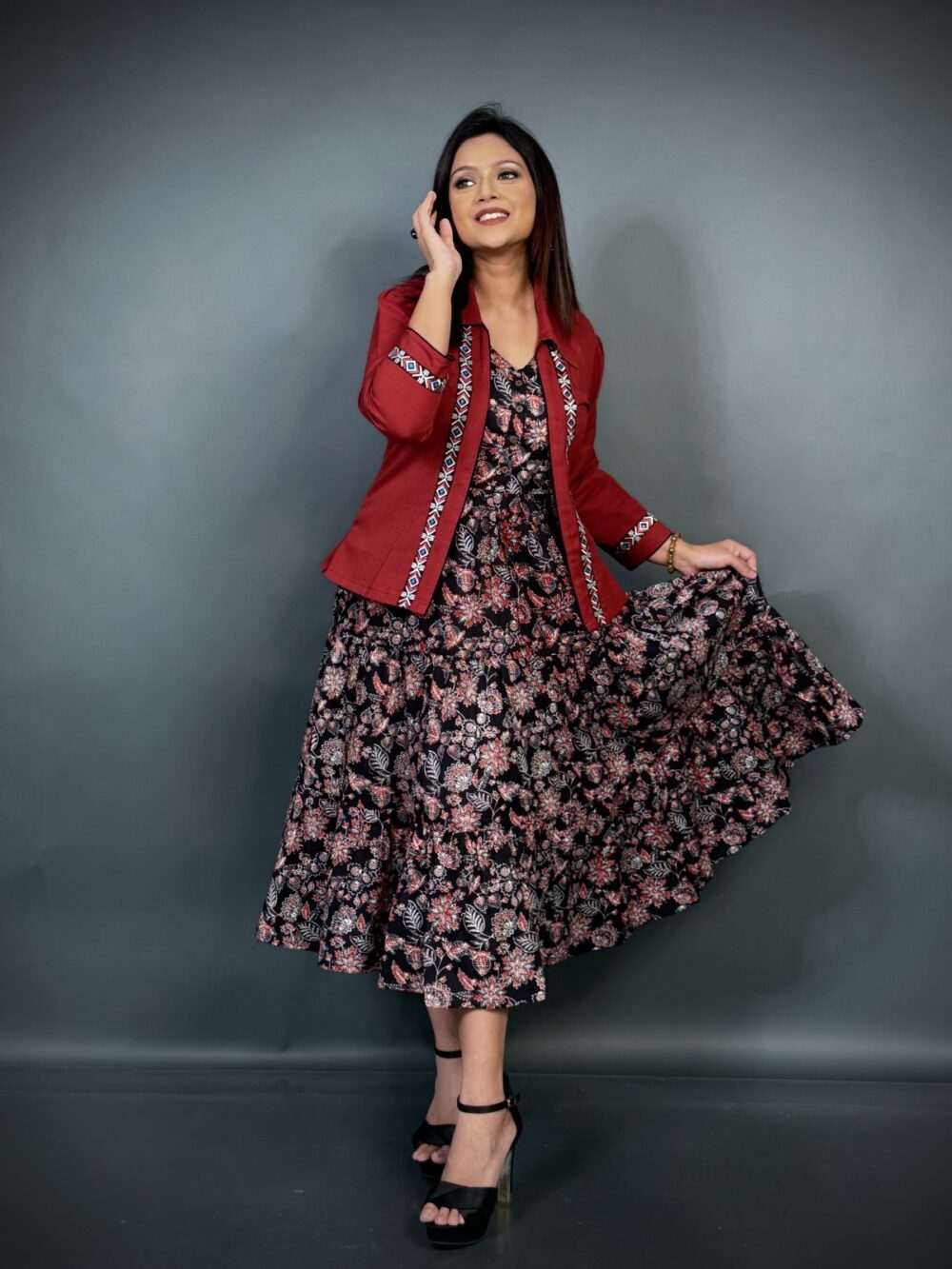 Black Glow–Cotton Frill Frock with Maroon Jacket