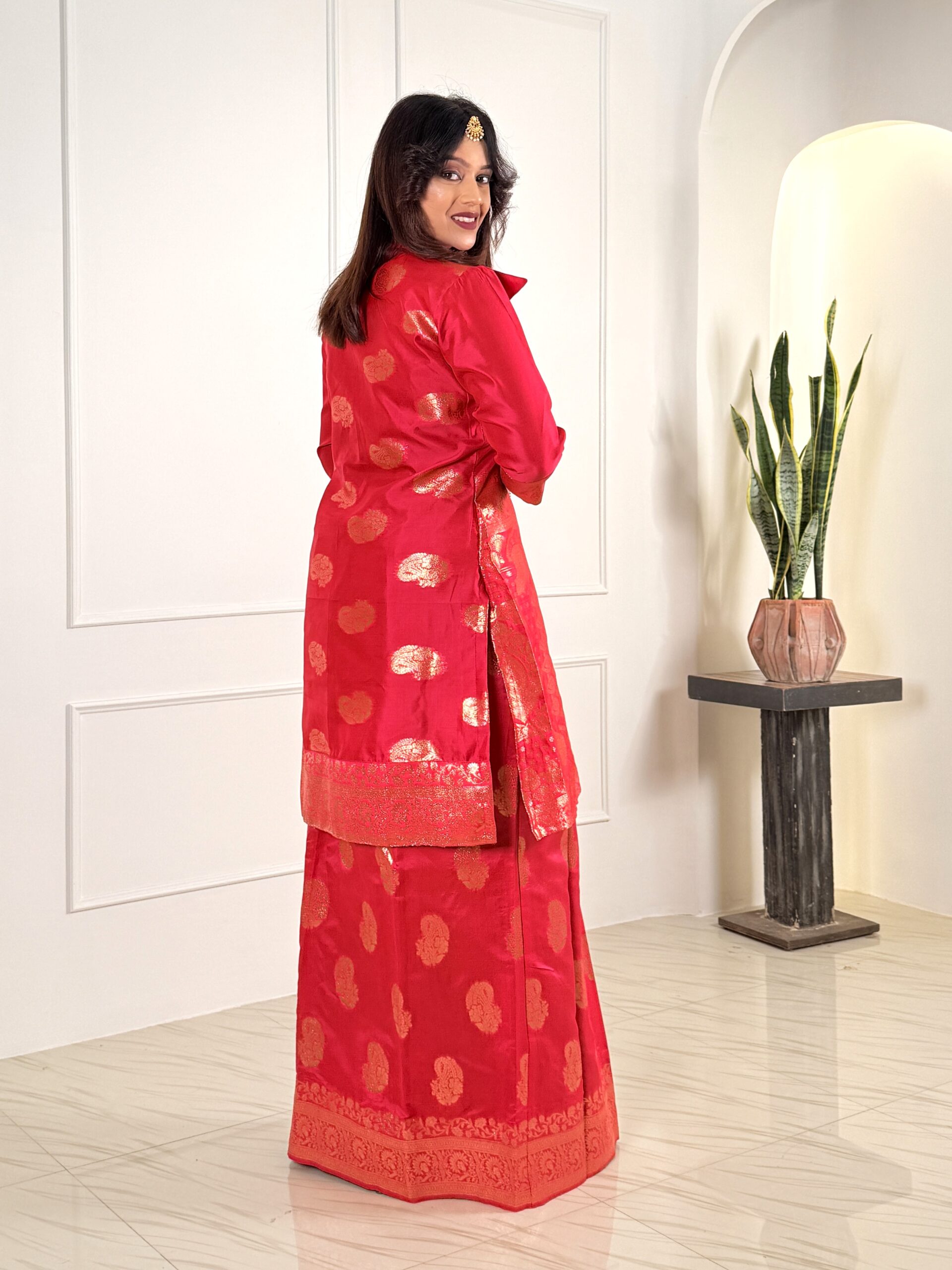 Step into elegance with the Blossom Red – Semi Katan Benarasi Plus Fusion Set, crafted to celebrate beauty, confidence, and charm in sizes 46 to 52. Designed in a rich tomato-red hue, this ensemble blends traditional Benarasi weaving with a modern fusion silhouette. The set includes a designer sleeveless blouse, a beautifully woven saree-style skirt with an attached petticoat and a convenient pocket, and a graceful 3/4th sleeve jacket that adds refinement and balance. The semi Katan Benarasi fabric lends a luxurious sheen, making this outfit a standout choice for parties, festive events, and special celebrations. Its slim-pattern style ensures a flattering fit without compromising comfort. Ideal for those who adore contemporary styling wrapped in cultural elegance. Price includes the full set, ensuring a complete and premium experience. For long-lasting beauty, dry clean only is recommended.