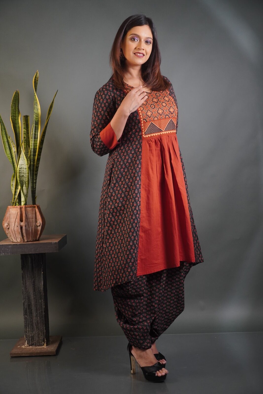Color: Bold black & maroon Ajrakh print dhoti pants paired with maroon pleated yoke frock