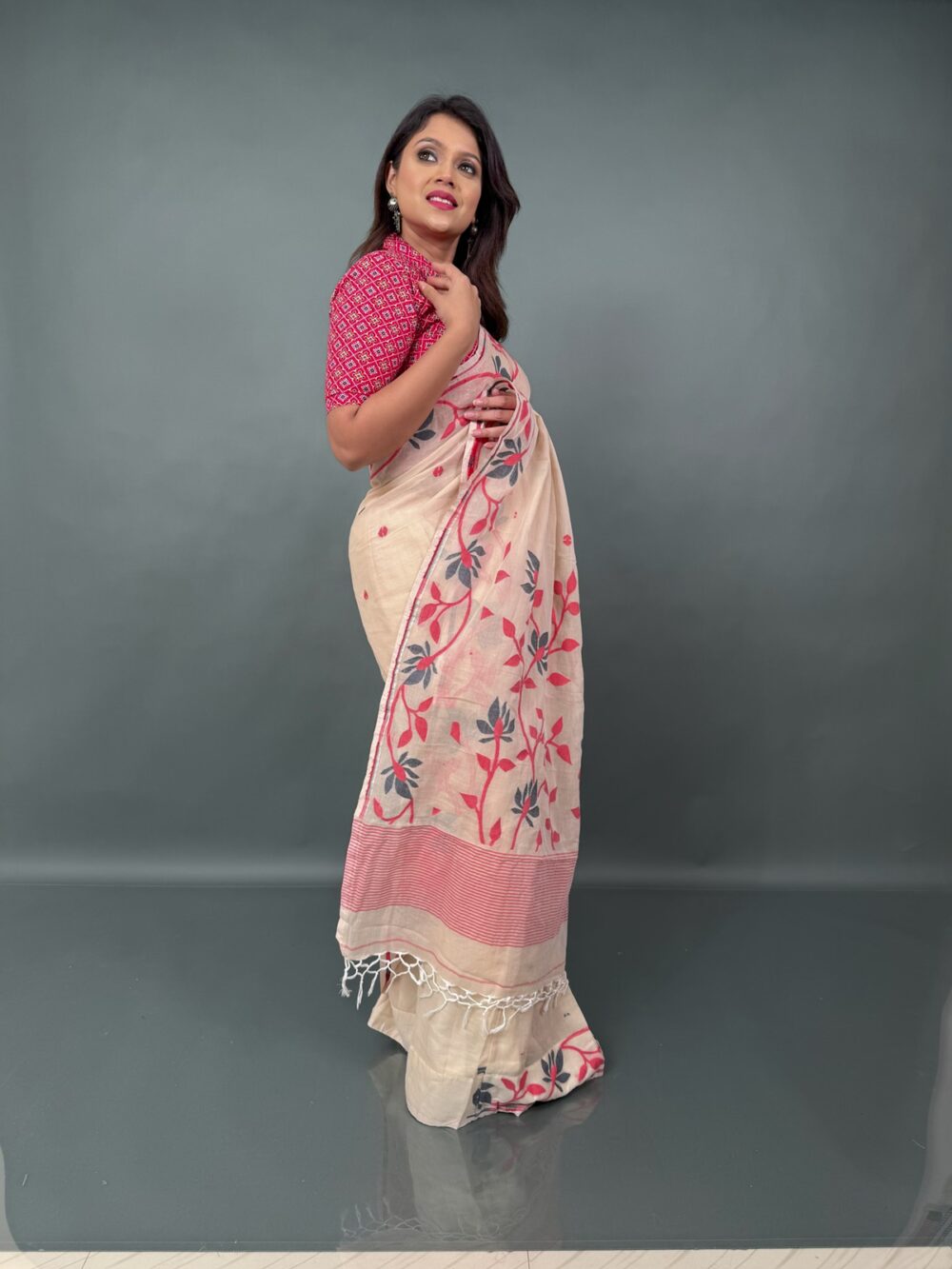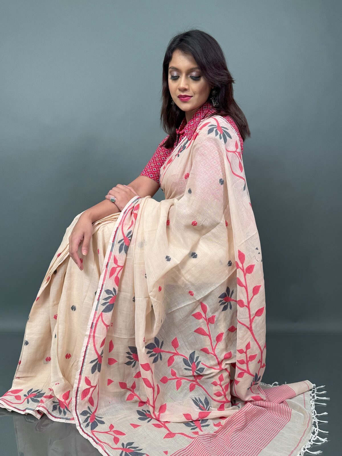 Chandrika Loom – Cream Khadi Insta-Saree with Red & Grey Handwoven Art