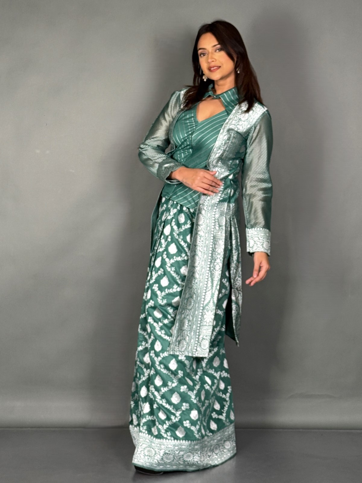Curvy Friendly Rama Green Jamdani Jacket Saree