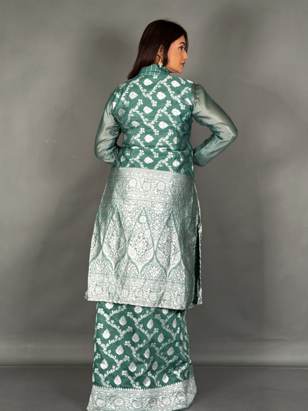Rama green Jamdani fusion jacket saree set designed for curvy women, featuring a pocketed skirt for comfort and style—perfect for party wear.