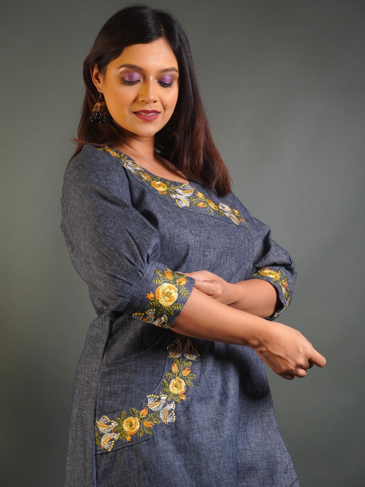 - Step into effortless style with this Blueish Grey Embroidered Khadi Co-ord Set, designed to blend traditional charm with modern flair.