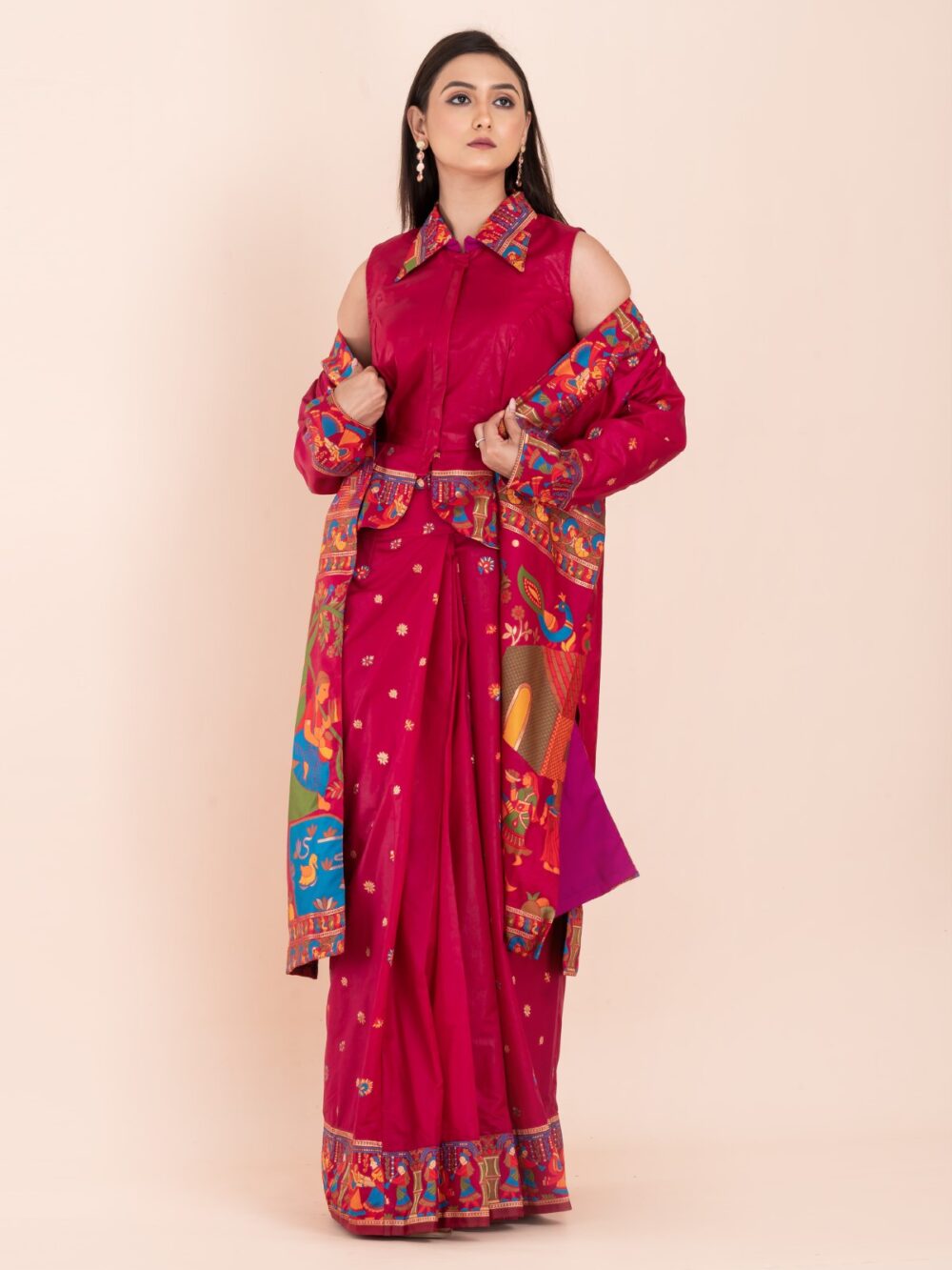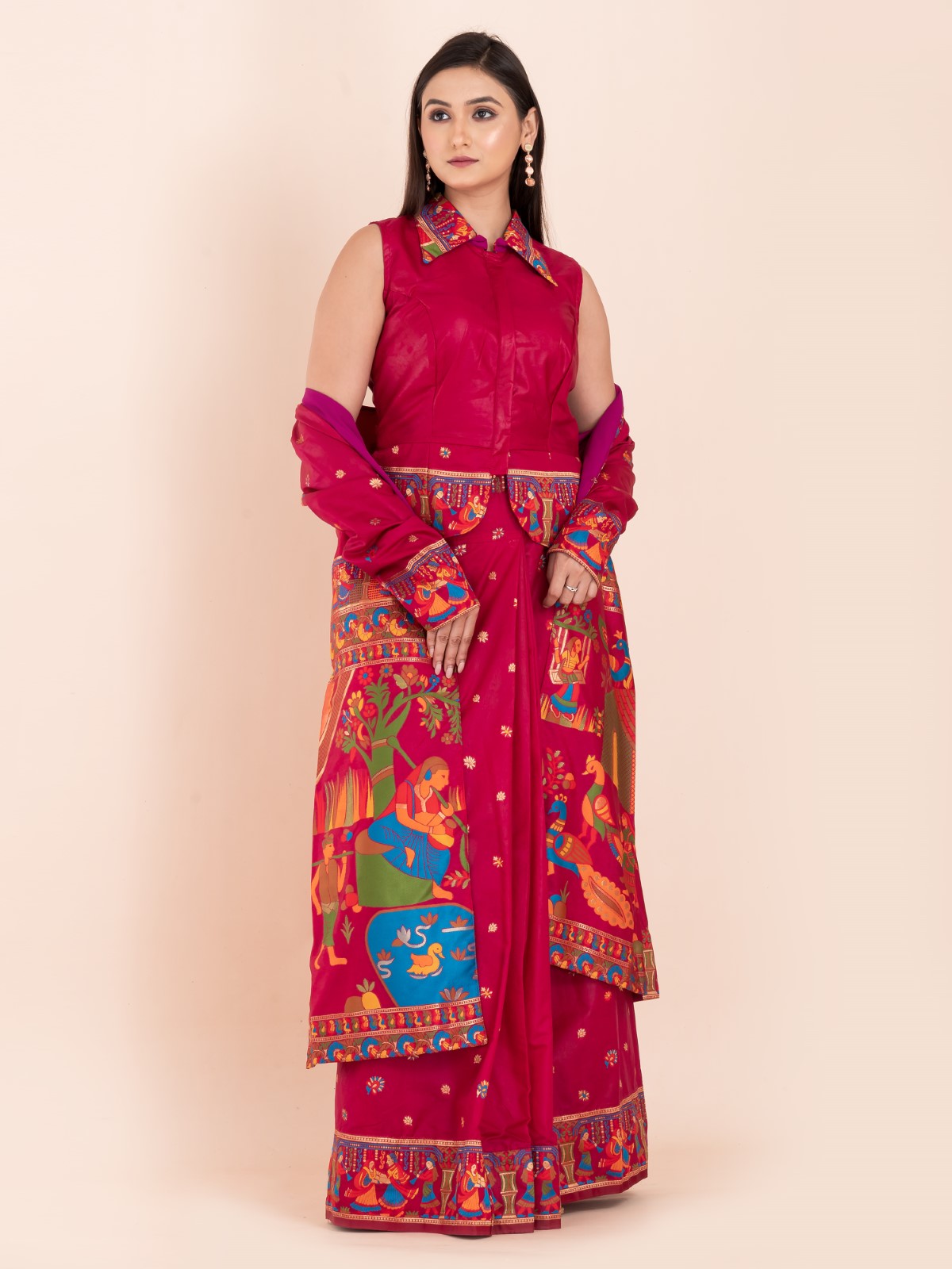 Elegant Fuchsia Pink Semi-Silk Insta-Saree Fusion Dress,Blouse, Skirt & Long Jacket