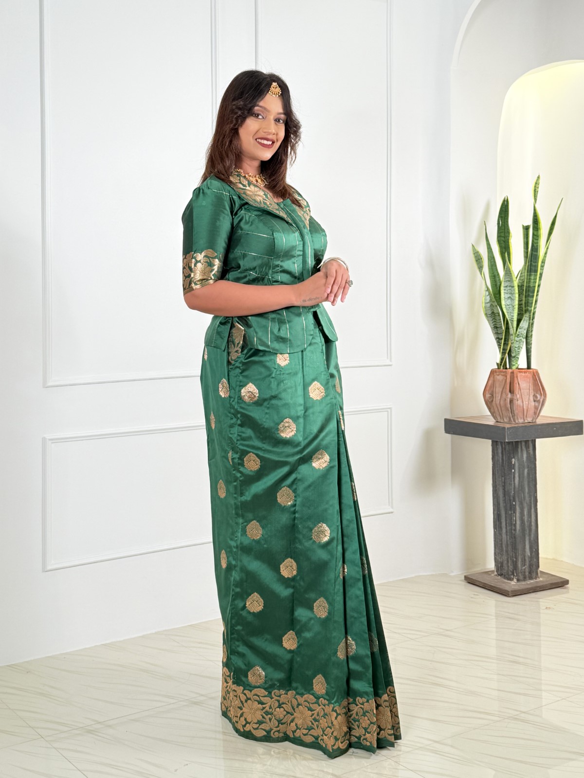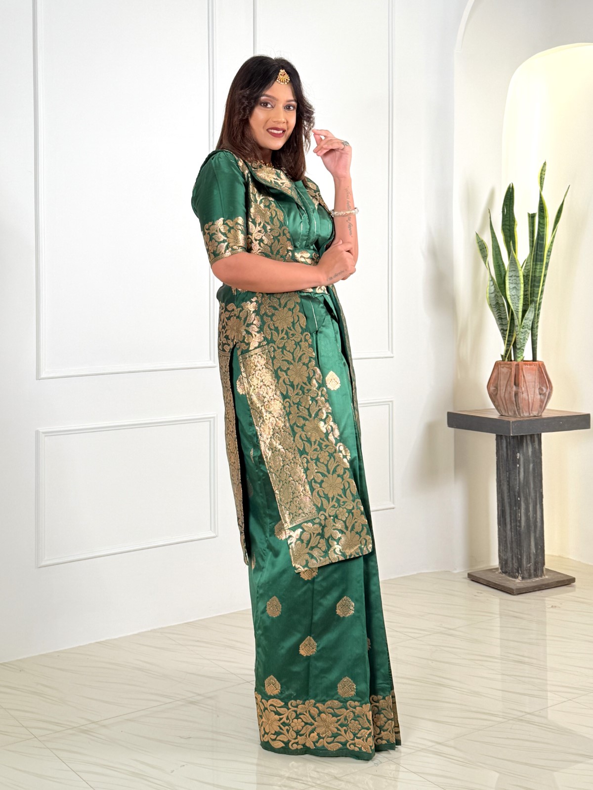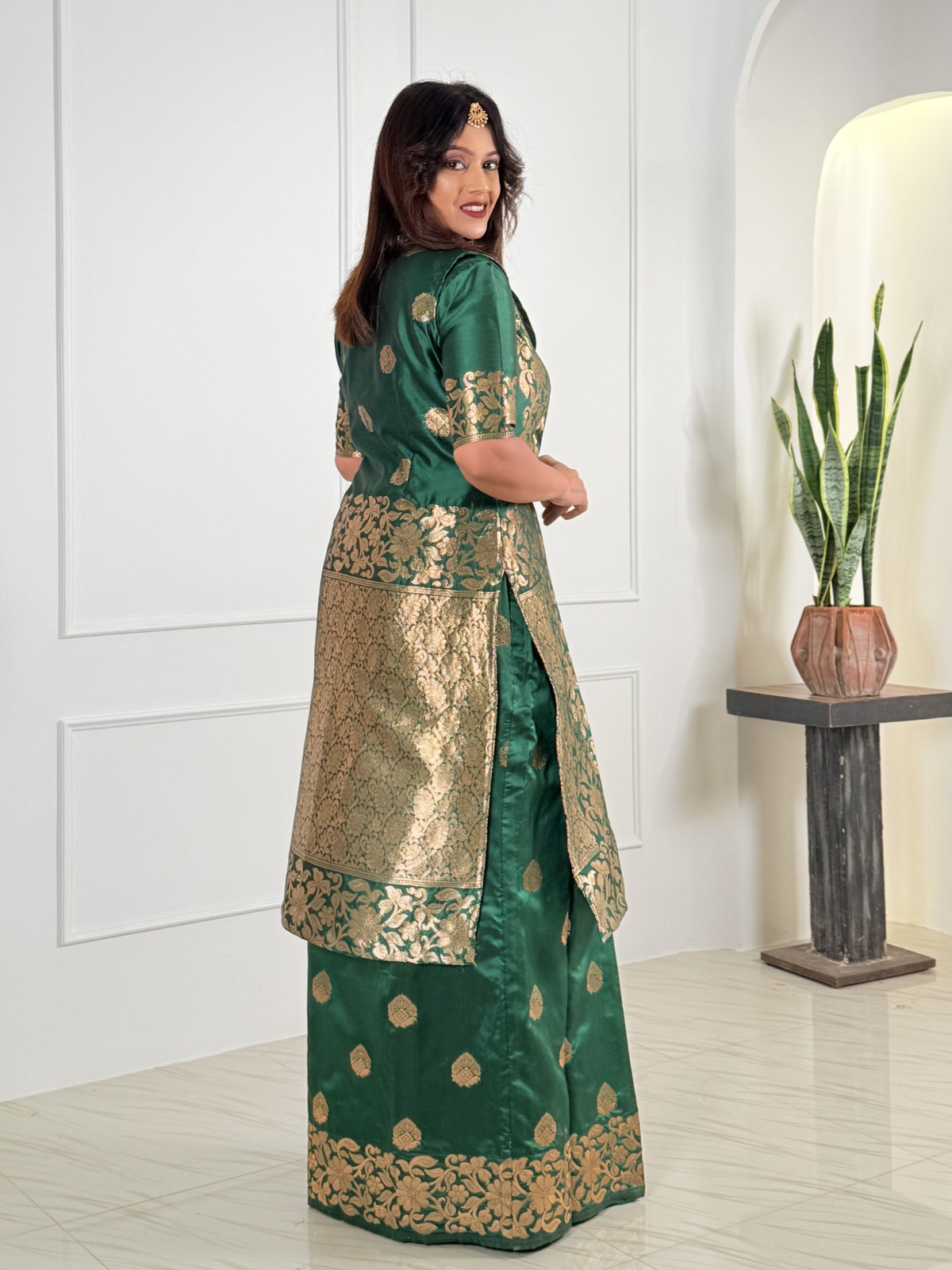 A refined forest green semi katan Banarasi fusion set featuring a blazer-style jacket, slim-fit saree skirt with pocket, and coordinated blouse—perfect for elegant partywear styling.