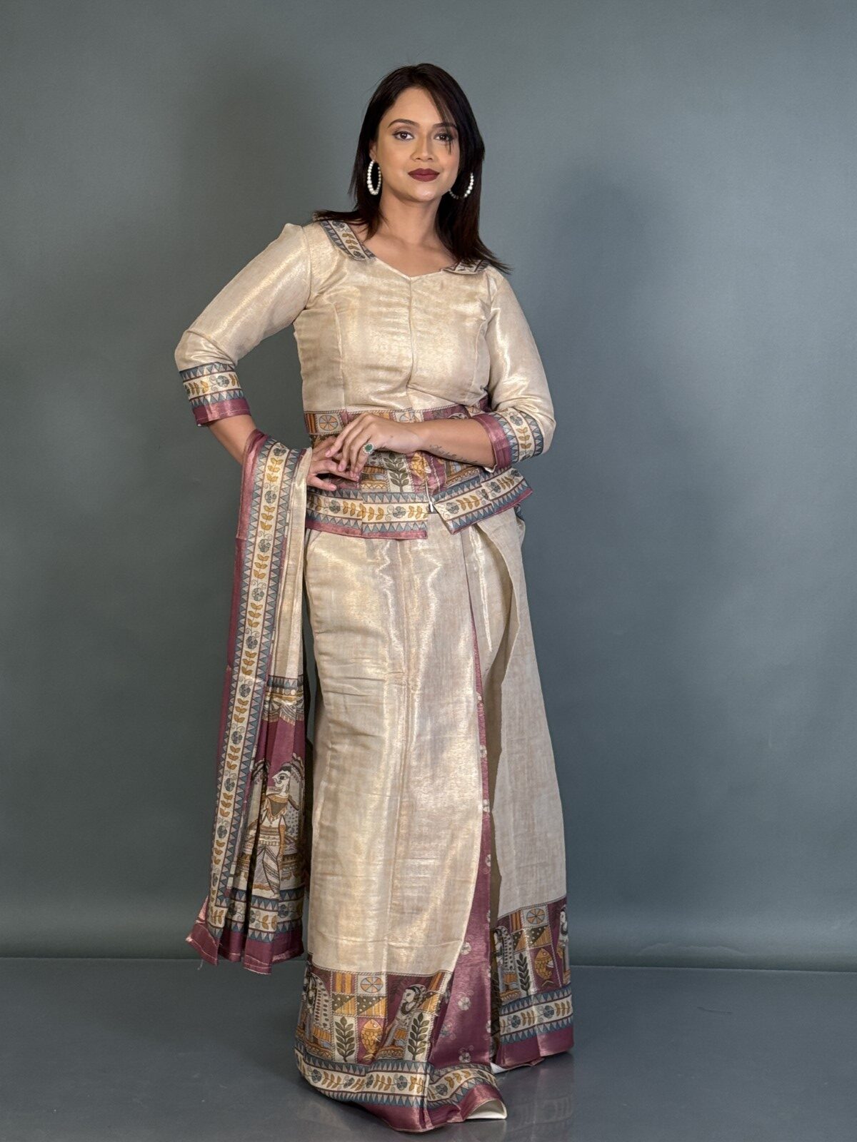 Be the first to review “Luminous Gold Wine Tussar Ready-to-Wear Saree” Cancel reply