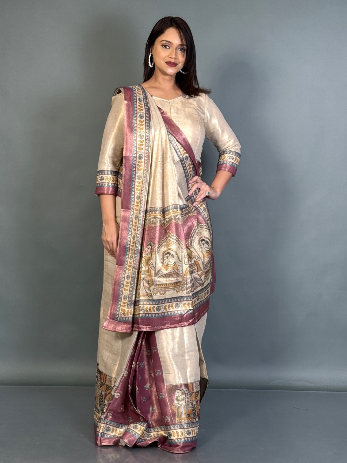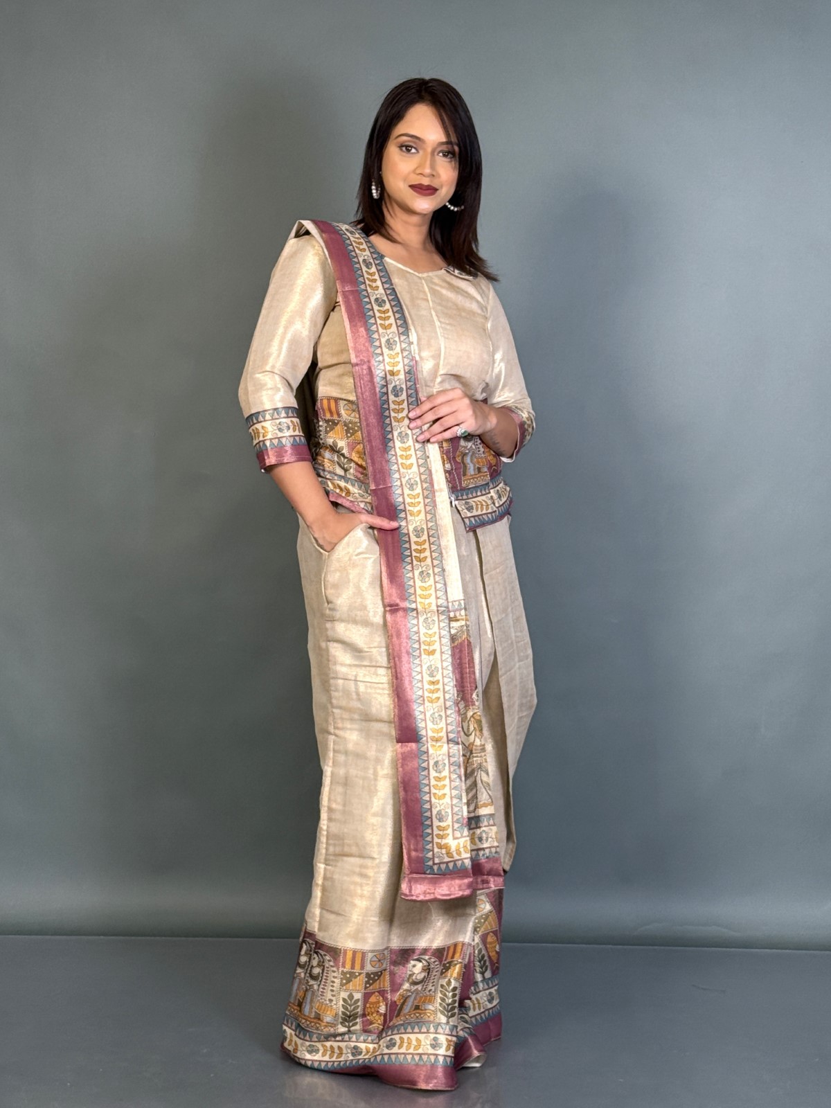 Luminous Gold Wine Tussar Ready-to-Wear Saree