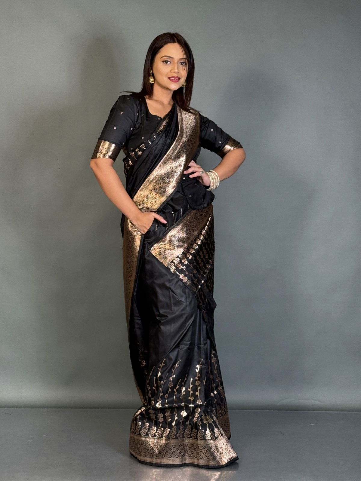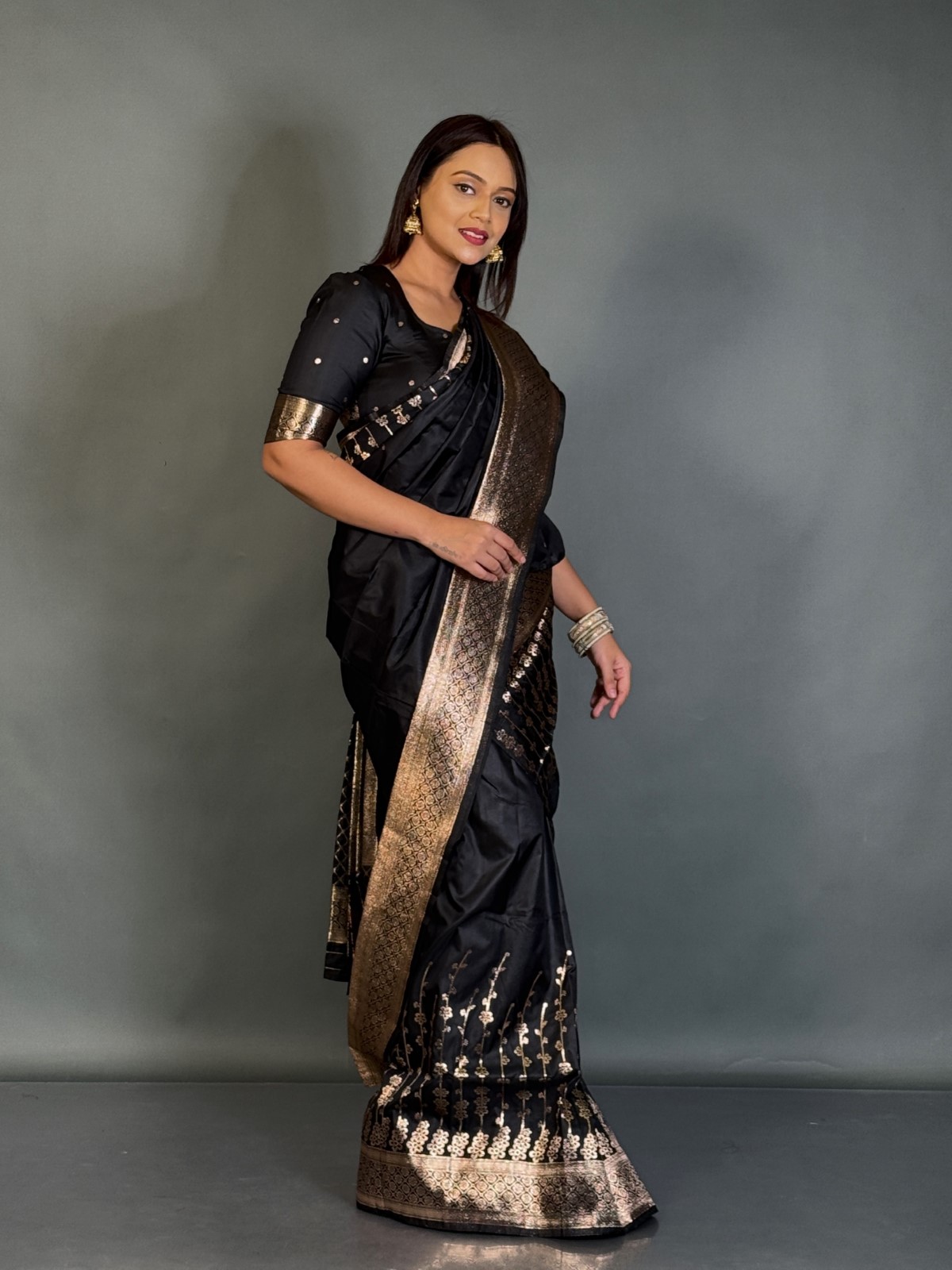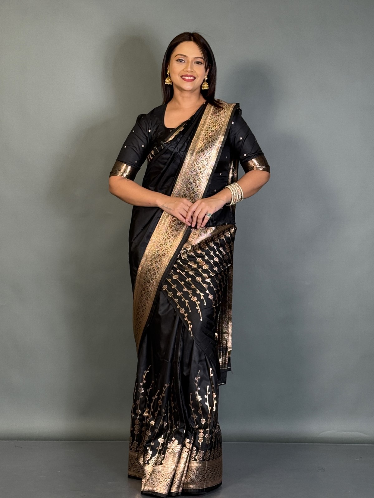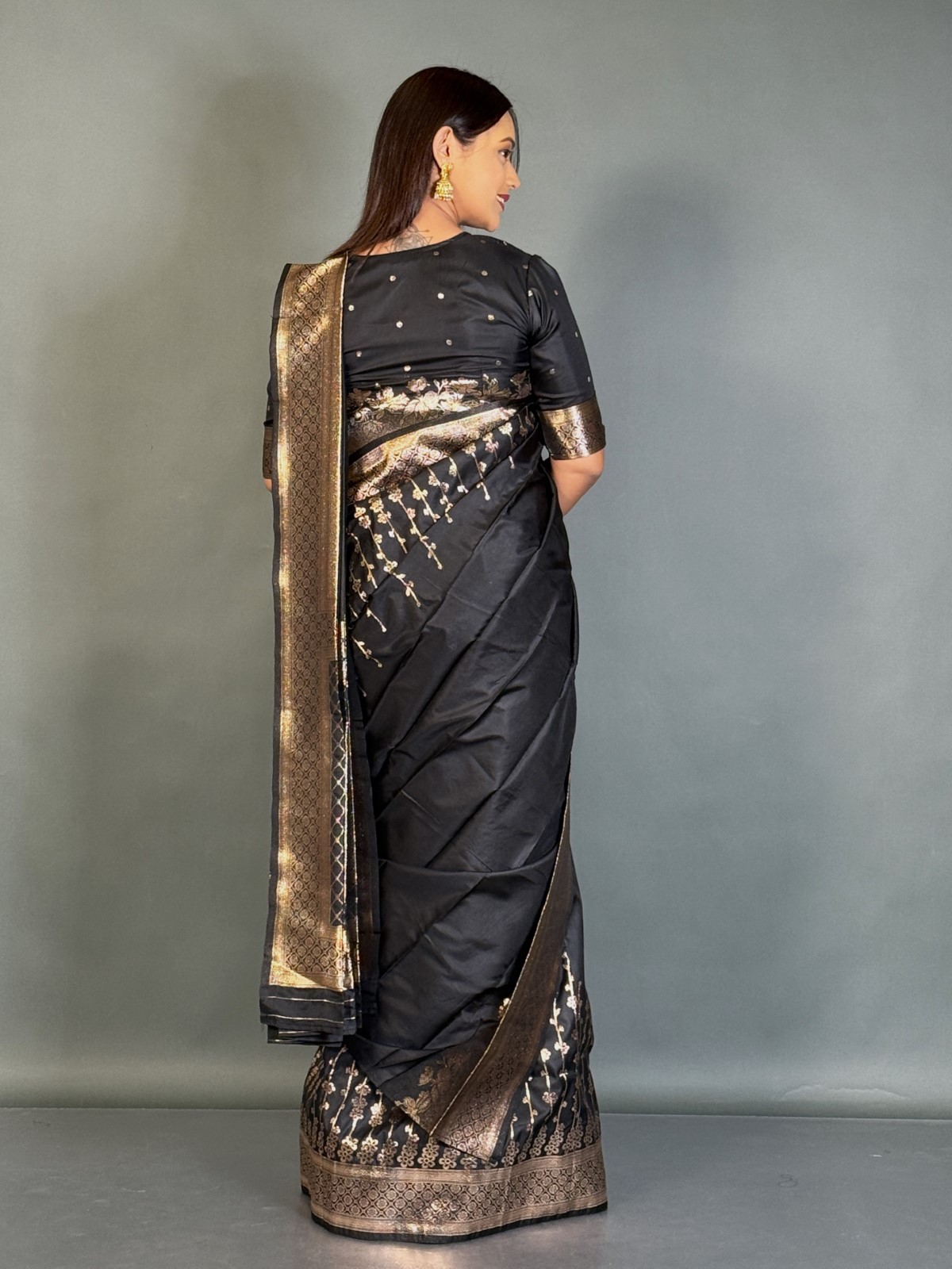Majestic Black Semi Katan Benarasi Ready-to-Wear Saree Set