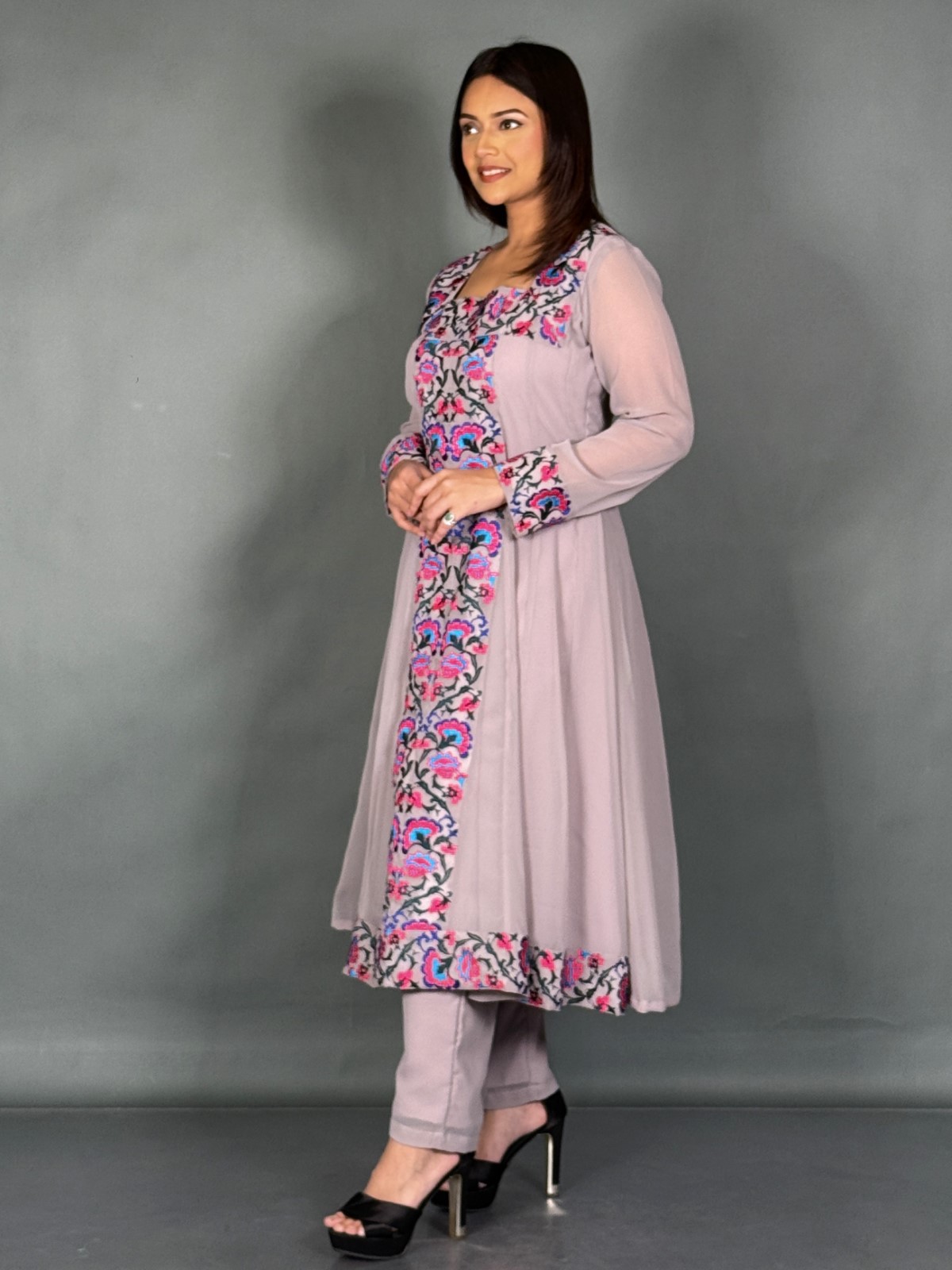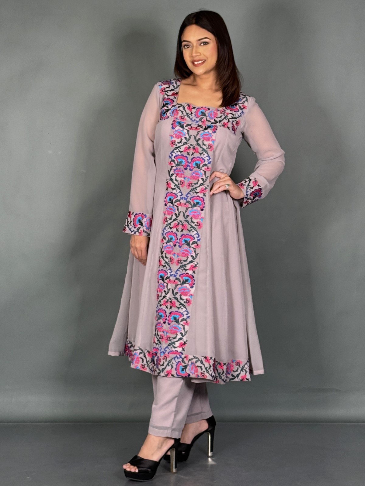 Elegant mauve georgette plus size Anarkali suit set with intricate embroidery, square neckline, and full sleeves — designed for comfort, confidence, and graceful partywear style.