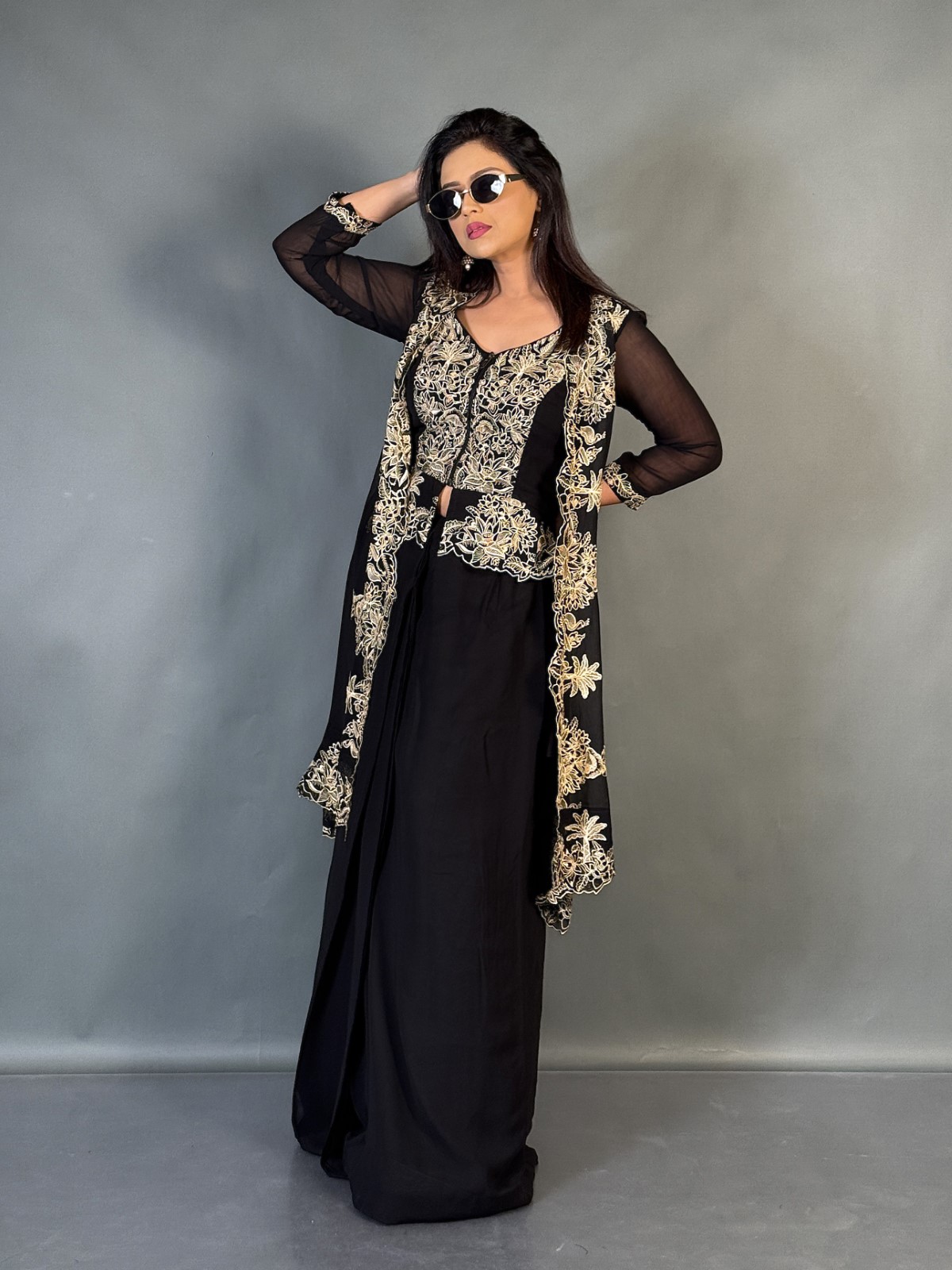 Step into effortless elegance with our Midnight Grace Plus Size Embroidered Fusion Set—a stunning 3-piece outfit designed exclusively for curvy silhouettes. Crafted from premium black georgette, this ensemble includes a sleeveless embroidered top, a 3/4th sleeve flowy jacket, and a slim-fit skirt with a handy pocket. The V-neckline enhances your neckline, while the lightweight fabric ensures all-day comfort. Ideal for partywear, festive events, or evening functions, this plus-size set blends traditional embroidery with a modern fusion style, offering a sophisticated yet trendy look. Available in sizes 46 to 52, it is tailored to flatter and fit beautifully. Whether you’re dancing the night away or attending a formal gathering, this outfit delivers grace, comfort, and standout style. Style it with metallic heels and bold earrings to complete your party look. Easy to care for with cold water hand wash or dry cleaning, this set is your go-to for elevated plus-size fashion.