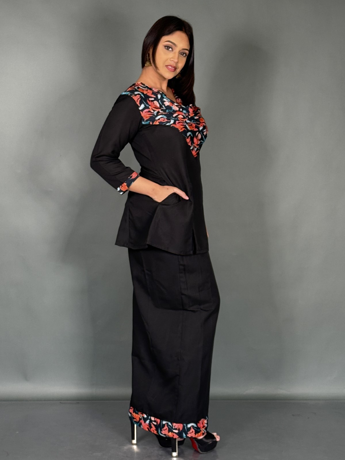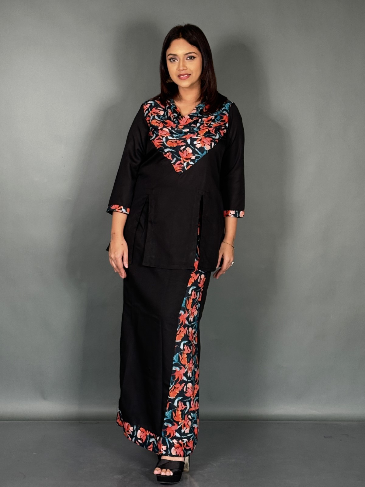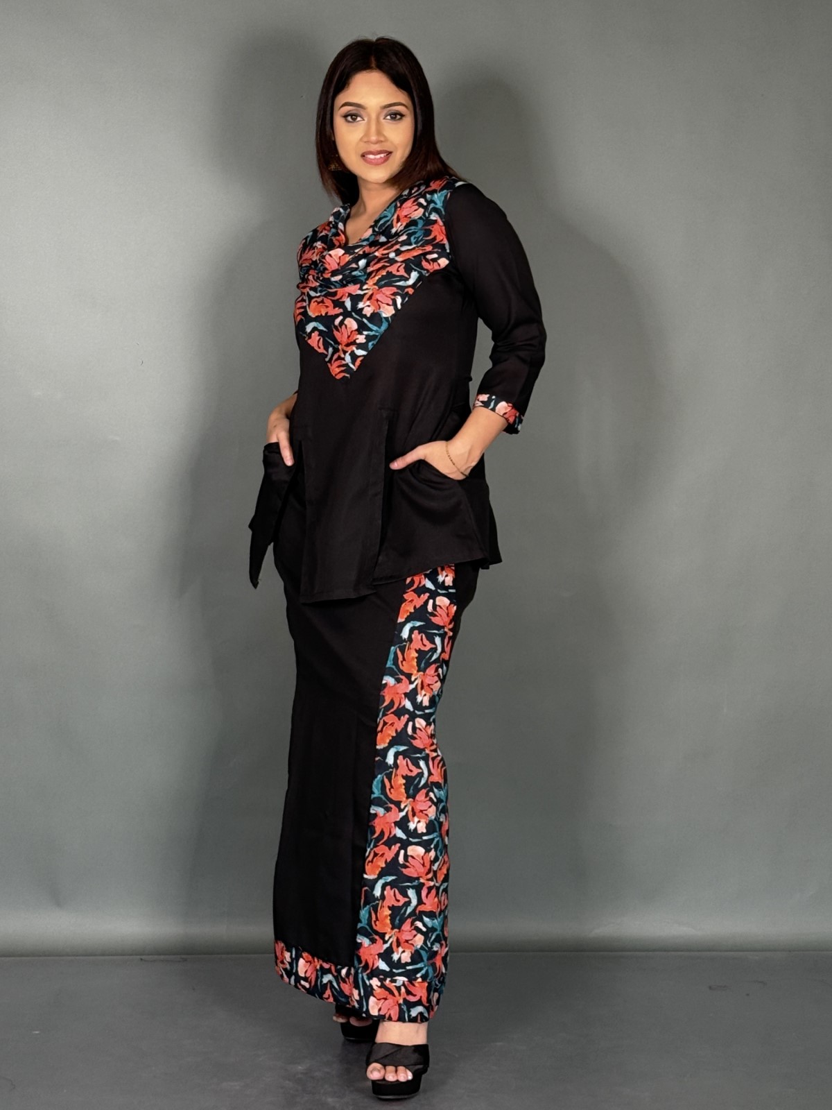 Elegant black crepe fusion set featuring a designer neck pouch kurti and matching skirt with pocket, adorned in vibrant Palash floral prints—perfect for partywear.