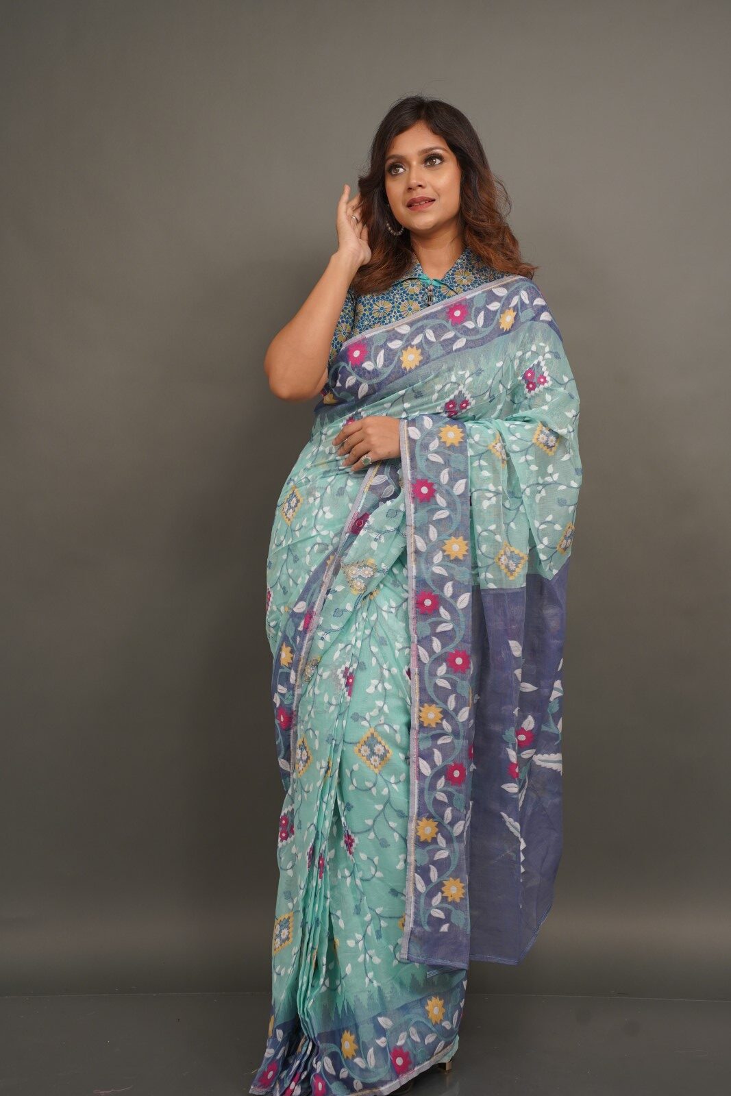 Feel the soothing charm of summer with “Mint and Blue” – an elegant ice-blue insta-saree crafted from soft reshom cotton, featuring traditional Jaamdani weaving and a hassle-free attached petticoat. Drape dignity in just seconds, perfect for your everyday graceful look.