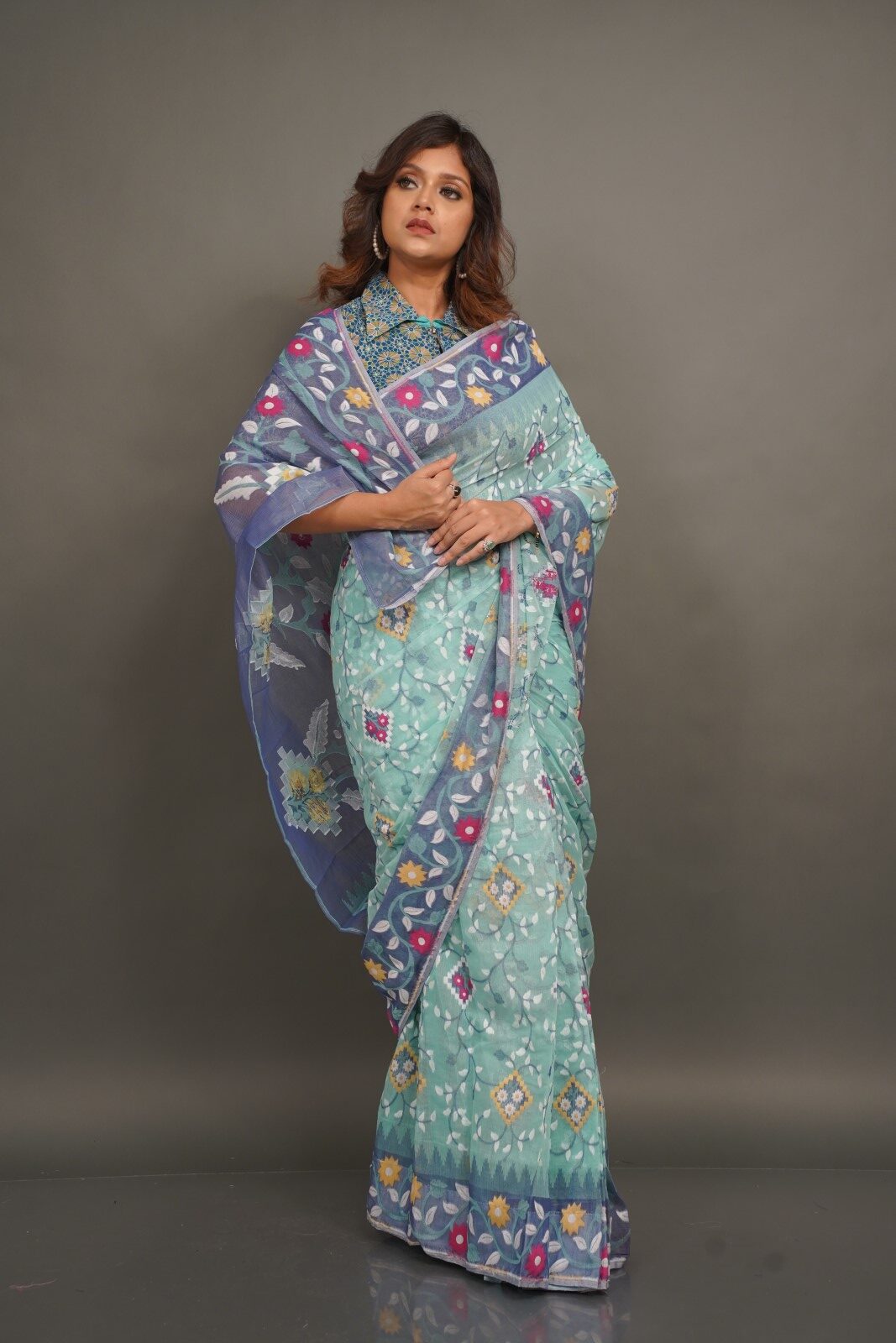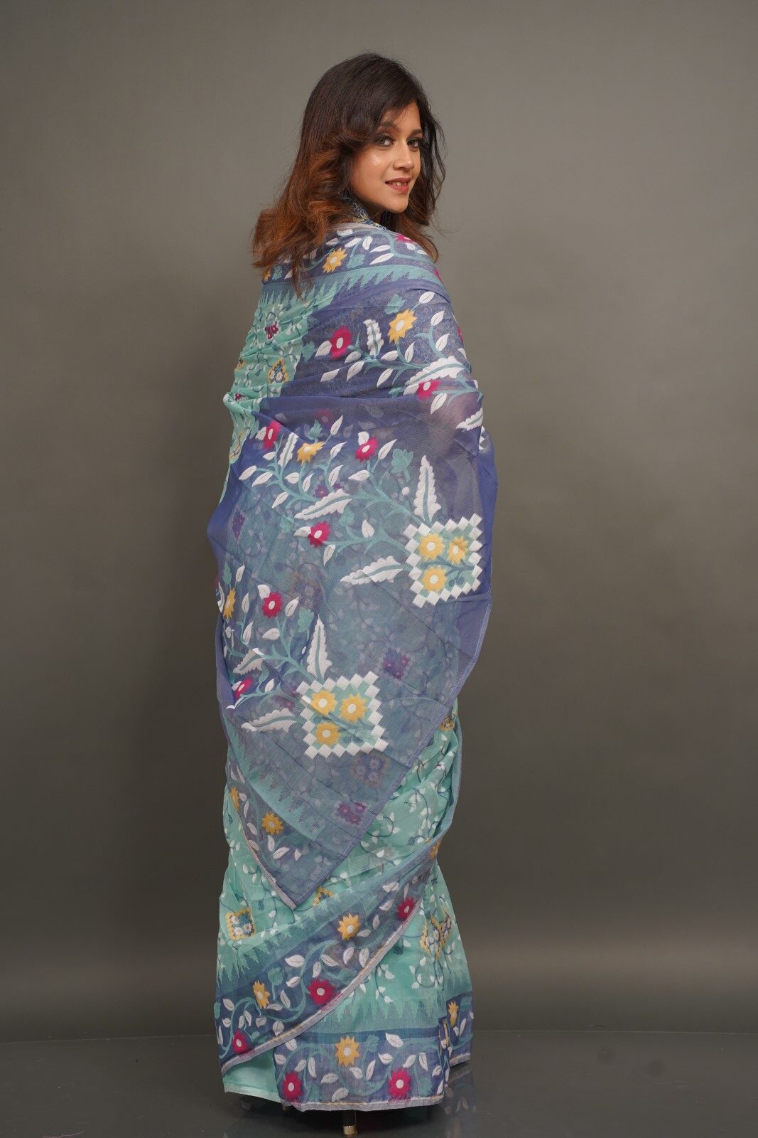 Mint and Blue Handwoven Jaamdani Insta-Saree with Attached Petticoat” (Ready-to-Drape 2-Piece Skirt Style Insta-Saree)
