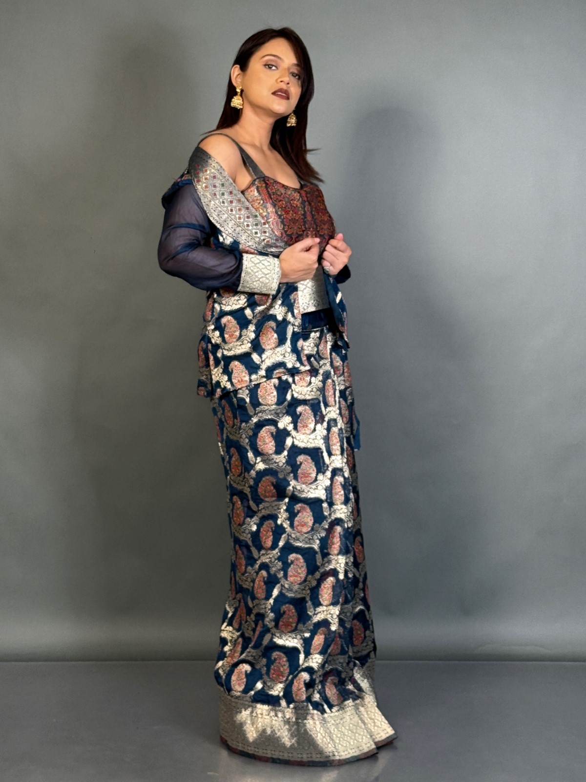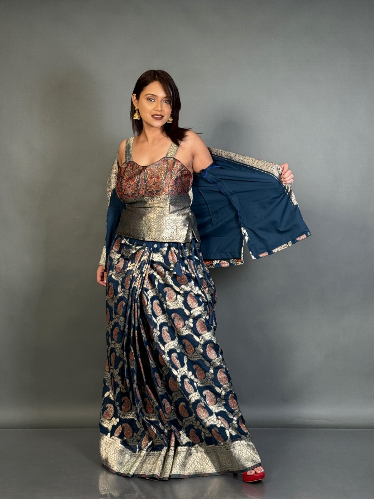 Elegant peacock blue fusion saree set crafted in semi tussar Banarasi fabric, featuring woven Minakari work, a stylish jacket, and a functional pocketed skirt—perfect for festive and party occasions.