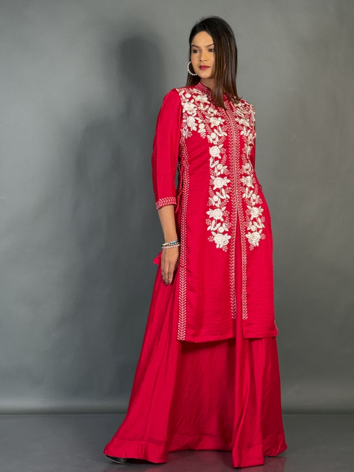 Make a powerful fashion statement with our Plus Size Glam hot pink gown set – thoughtfully designed for curvier silhouettes in sizes 46 to 52. This 2-piece ensemble includes a full-length dola silk gown and a matching sleeveless designer jacket, making it a standout pick for parties and festive events. The gown features a flattering slim-fit cut with a square neckline and elegant 3/4th sleeves, while the jacket brings a chic flair with its modern neck design. Adorned with delicate machine parsi work, this set blends ethnic charm with contemporary style. Crafted in lightweight fabric, it ensures comfort without compromising on glamour.