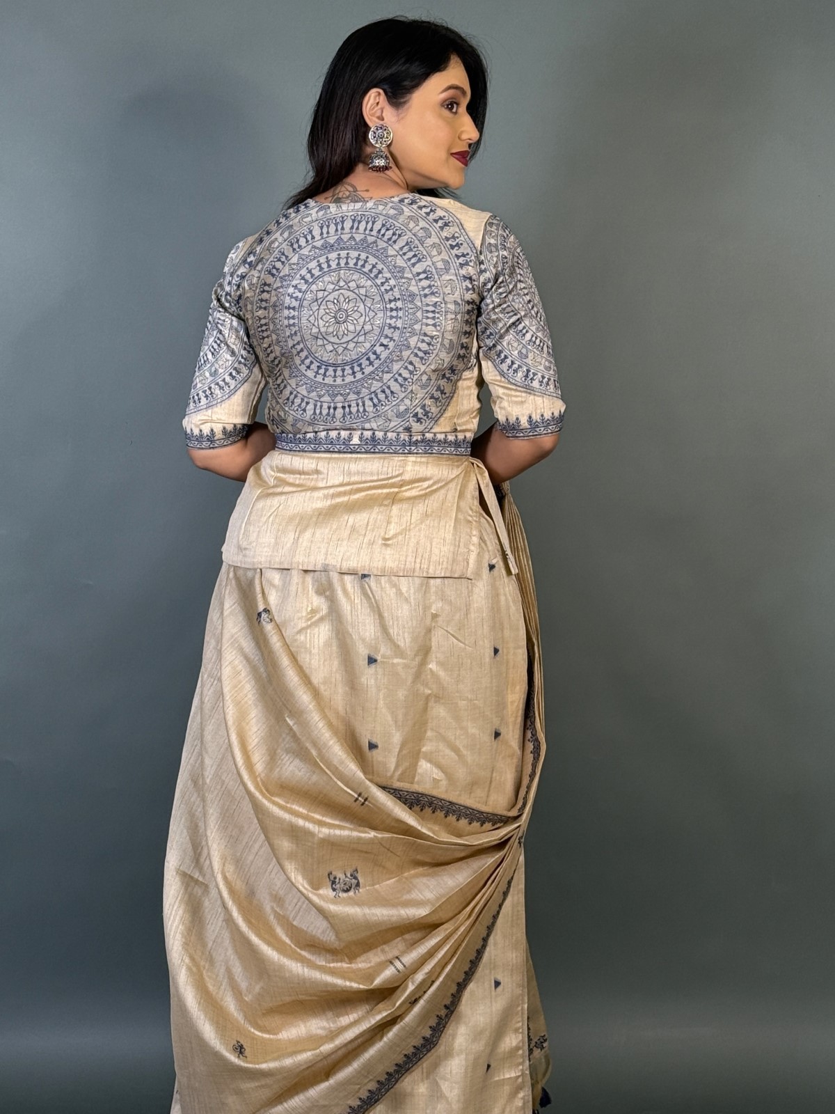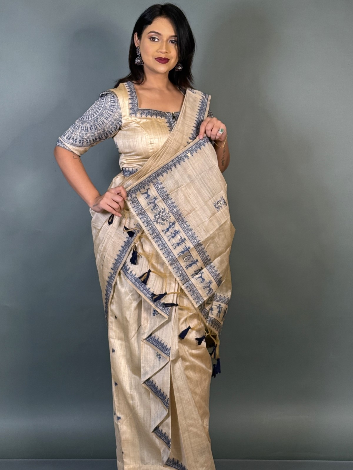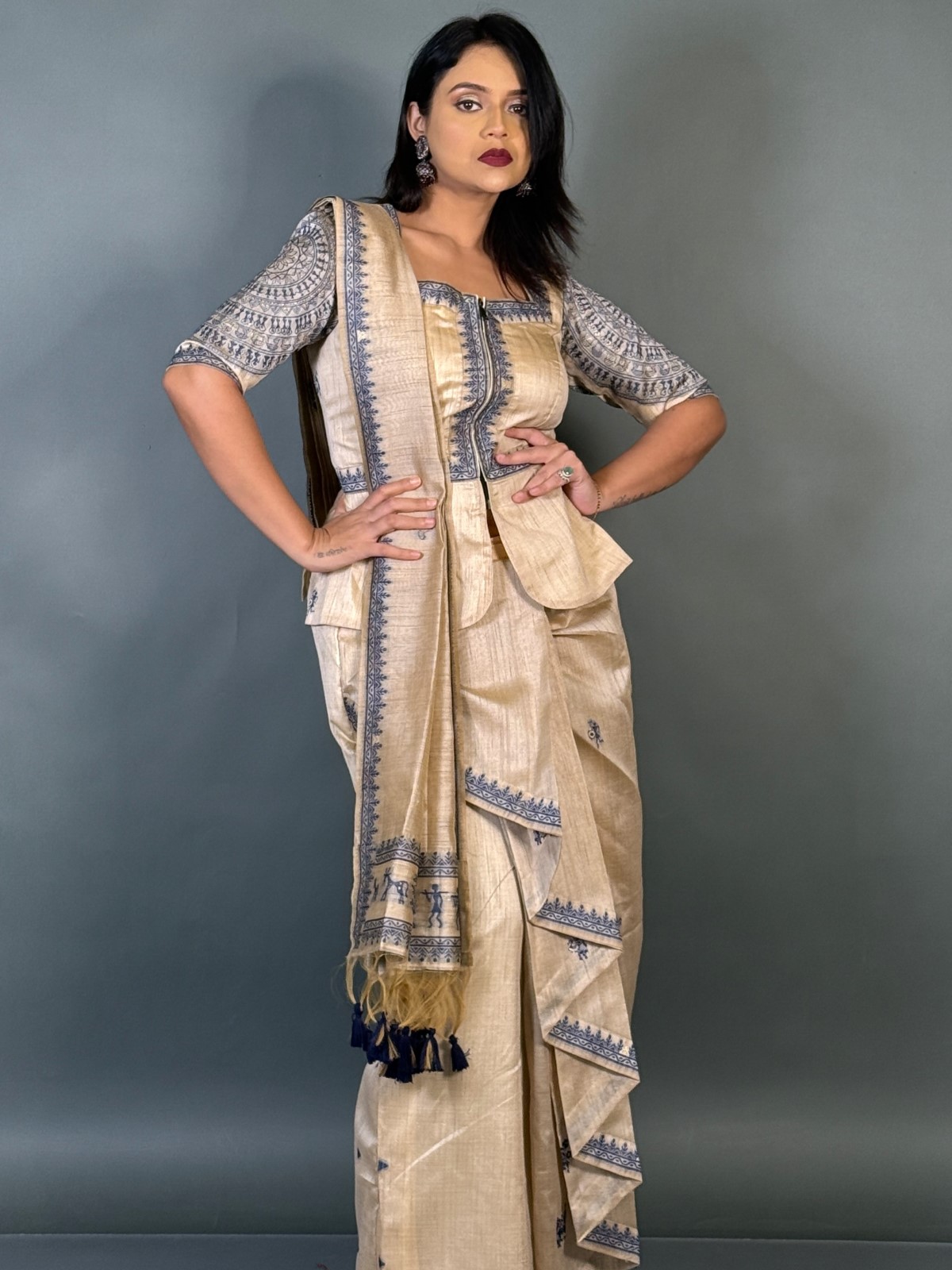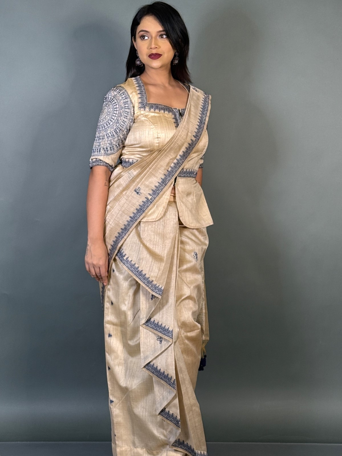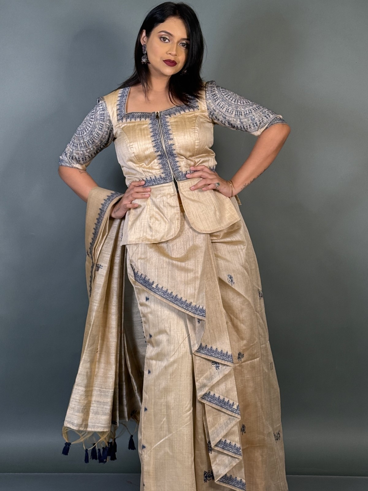 Regal Virgin Tussar & Navy Blue Ready-to-Wear Saree Set