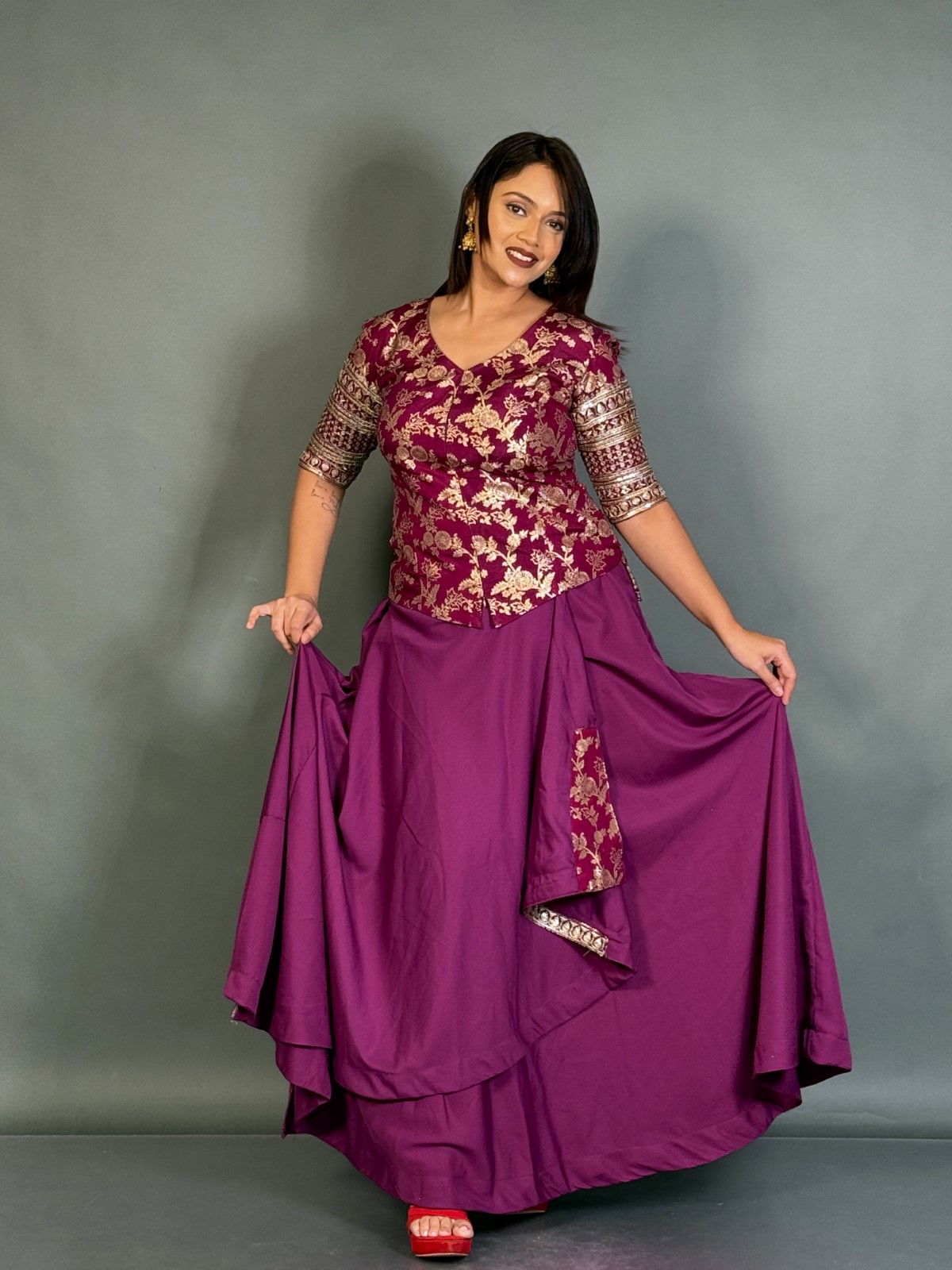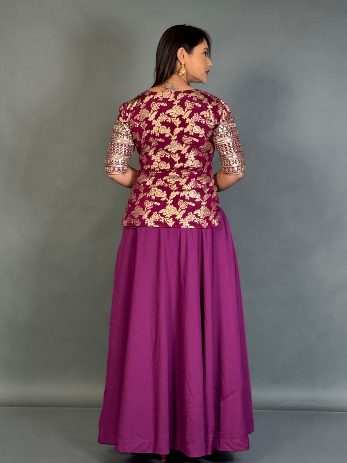- Bring elegance to your festive look with the Rich Wine Embroidered Blouse in Benarasi Silk and Skirt Fusion.