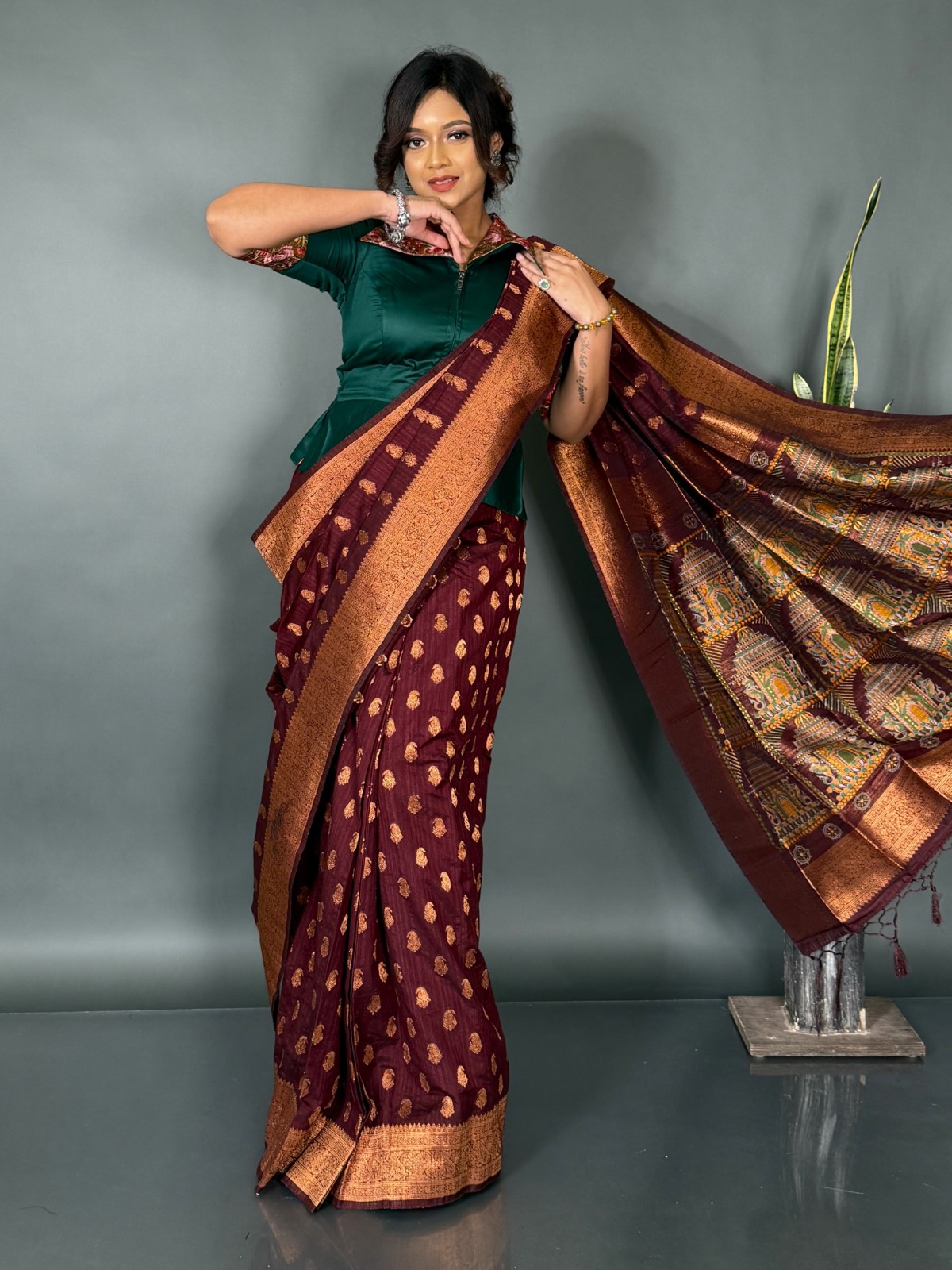 - Introducing the Royal Cocoa – Luxe Benarasi Ready-to-Wear Saree, a premium ethnic statement for stylish women who seek elegance with ease.