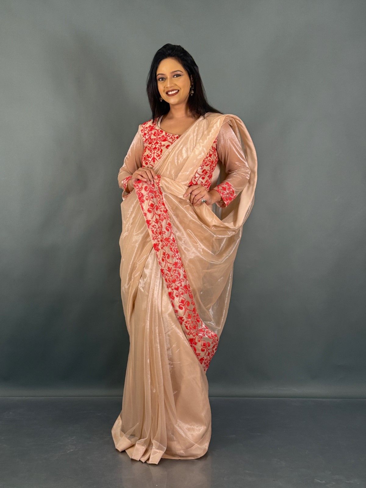 Evoke soft sophistication with “Whispers of Peach”, a stunning ready-to-wear saree dress designed for the modern muse. Crafted from luxurious Brasso Tissue fabric, this pre-stitched saree features an effortlessly draped silhouette, eliminating the need for pins or pleats. The sleeveless gown base pairs beautifully with a 3/4th sleeve attached blouse, all in a dreamy peach pink hue that flatters every skin tone. Intricate embroidery work adds a delicate shimmer, perfect for parties, festive occasions, and evening events. The outfit includes a built-in blouse and petticoat, making it a complete, no-fuss ensemble. Designed to fit sizes 38 to 42, it offers a slim, elegant fit that enhances your natural curves while offering all-day comfort.