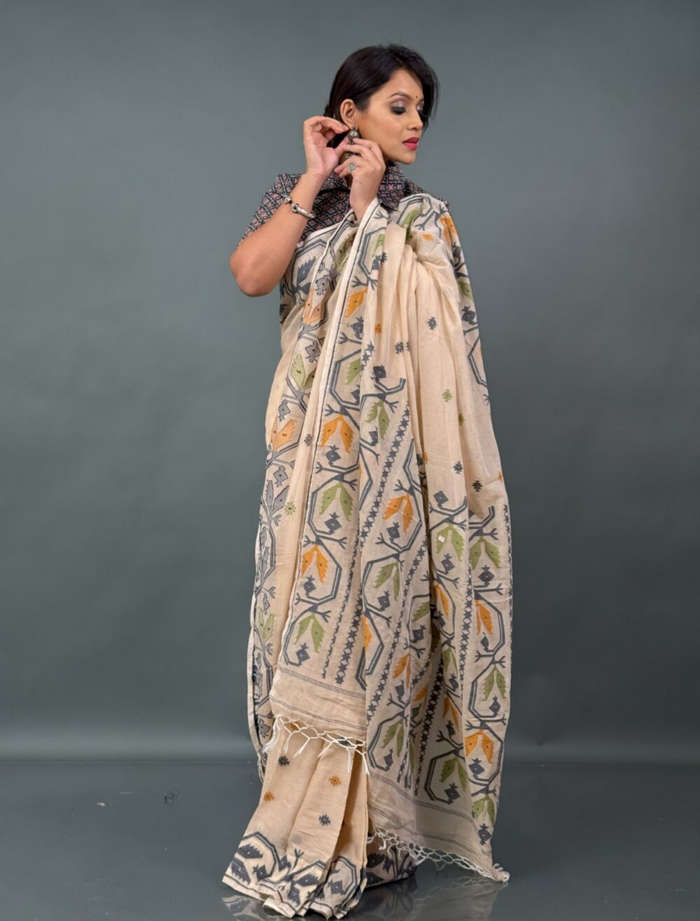 Kshir-Taru – Cream Khadi Insta-Saree with Mustard, Green & Grey Buti Weaving
