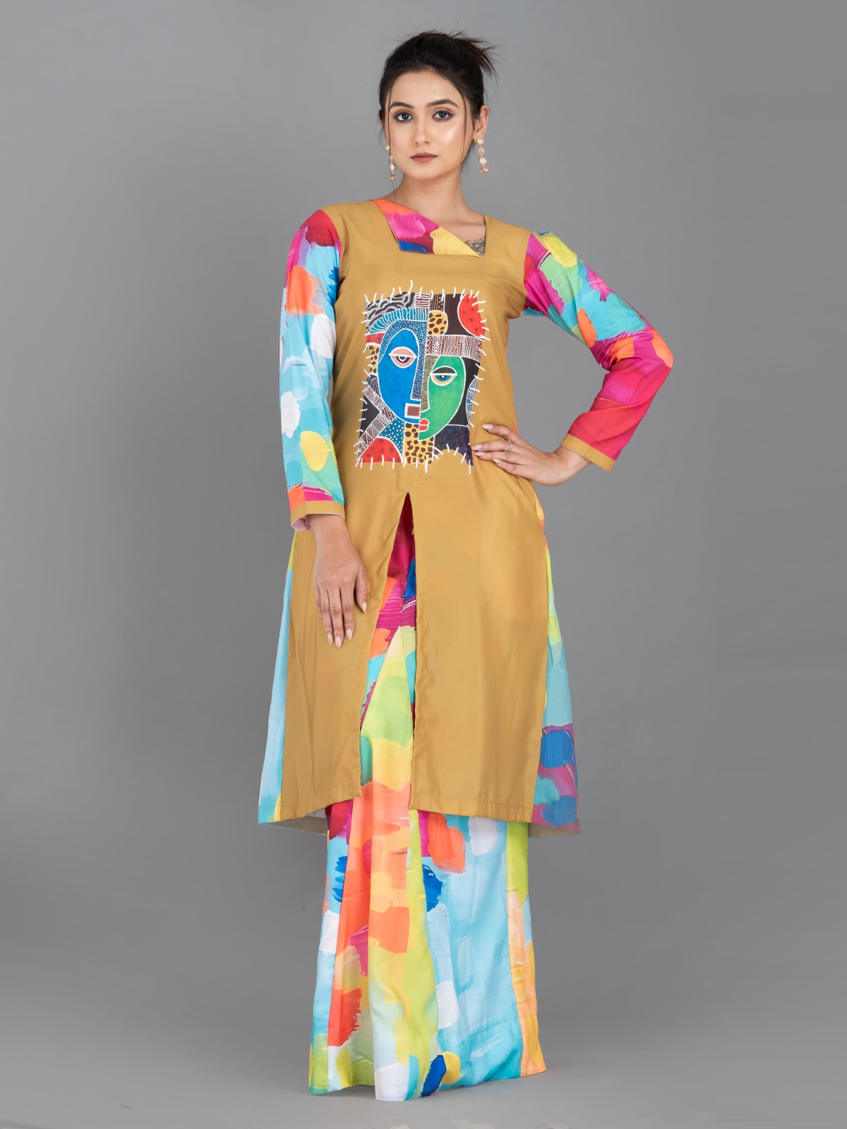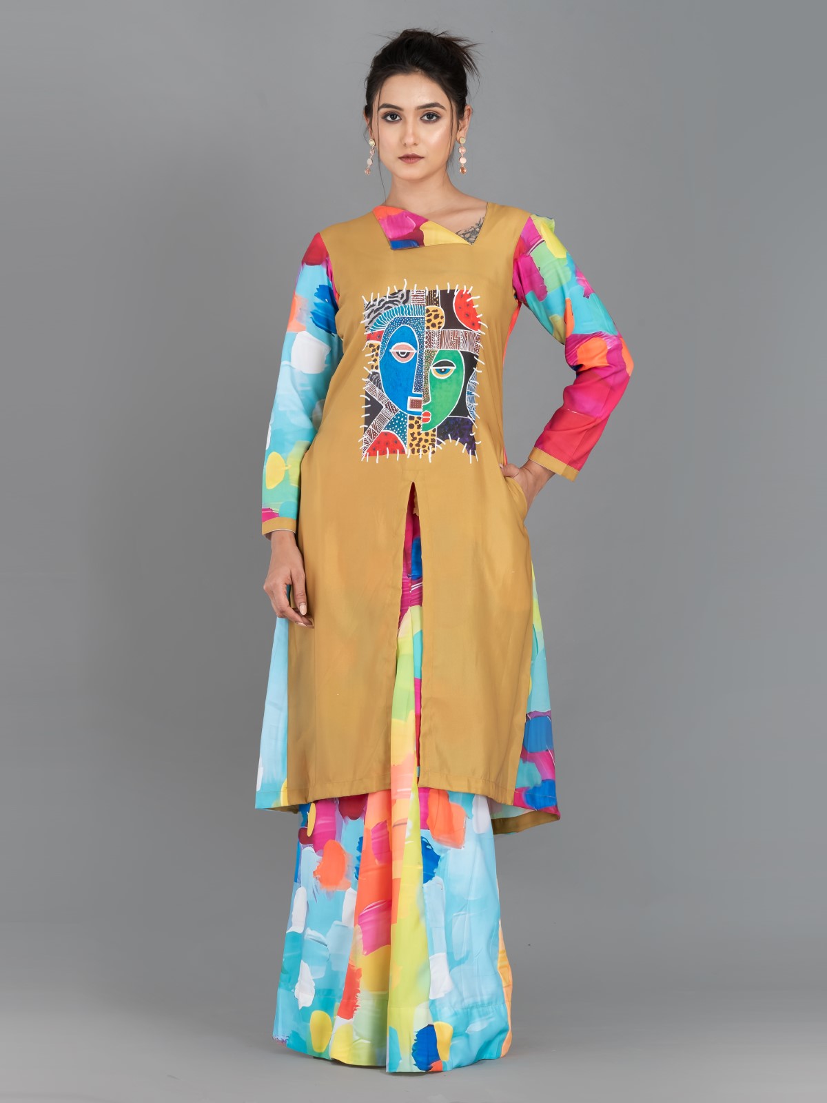 Elevate your style with our Lime Radiance Indo-Western Co-ord Set, a perfect blend of ethnic charm and contemporary fashion. Designed for festive celebrations, weddings, and special occasions, this ensemble features a refreshing lemon yellow base with vibrant multicolored accents, creating a striking visual appeal. The front part of the outfit showcases a unique abstract face art design, adding a modern artistic touch that sets this piece apart. Crafted from premium cotton fabric, it ensures both comfort and elegance. Whether you’re attending a Haldi ceremony, a cocktail party, or a festive gathering, this trendy fusion outfit will make you stand out. Pair it with statement jewelry and stylish footwear for a complete look. Shop now to embrace the perfect balance of tradition and modernity!