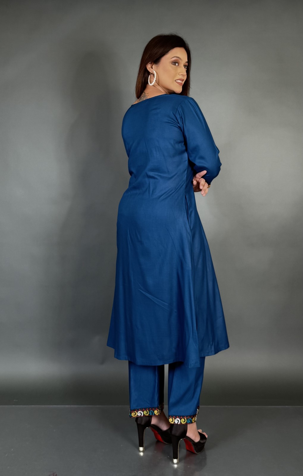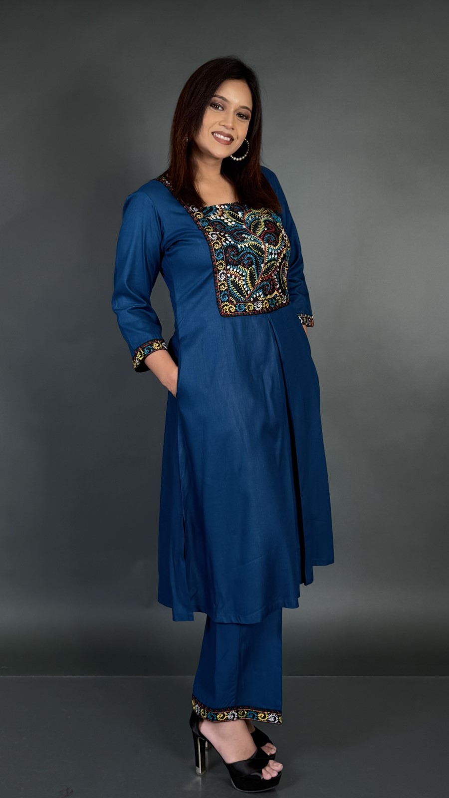 - The square-neck 3/4th sleeve top features elegant box pleats that flatter your silhouette while discreetly hiding the tummy. Both the pant and top include functional pockets, offering practicality with style. The peacock blue hue brings freshness and serenity to your wardrobe, making it a standout addition this season.