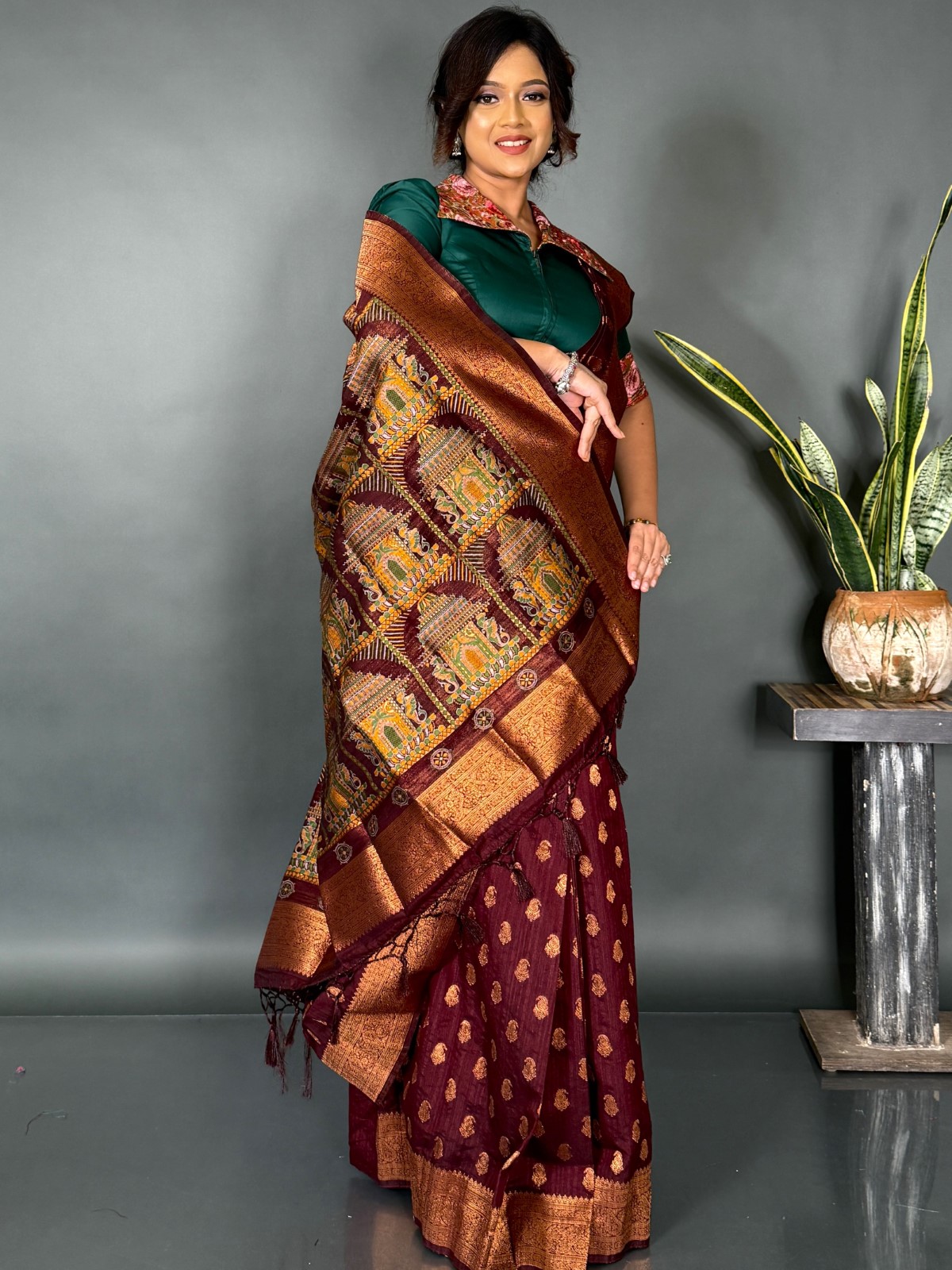 - Crafted from high-quality semi Tussar Benarasi fabric